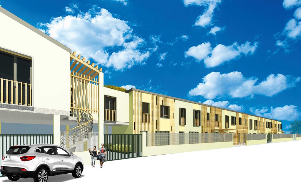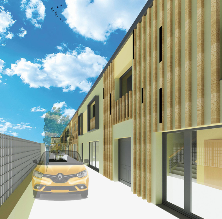 le projet consisite à réhabiliter un bâtiment existant à l'abaondan en programme de 7 logements et local bureau. la longueur de la facade et la régumarité géométrique des logements nous a conduit à traiter la façade avec une trame en bois ponctuée de peinture disposées de maniére aléatoire pour casser la linéarité.